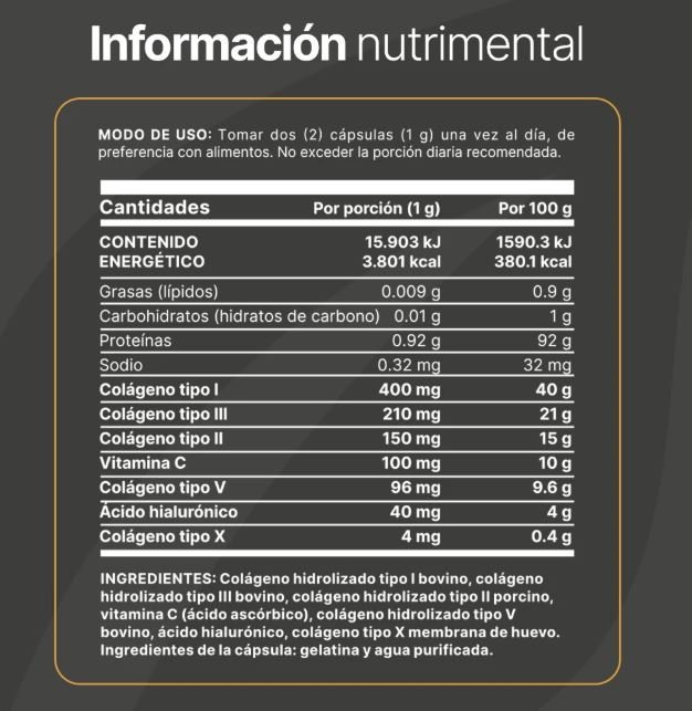 Esta composición especial está complementada con vitamina C y ácido hialurónico, en una práctica presentación en cápsulas.