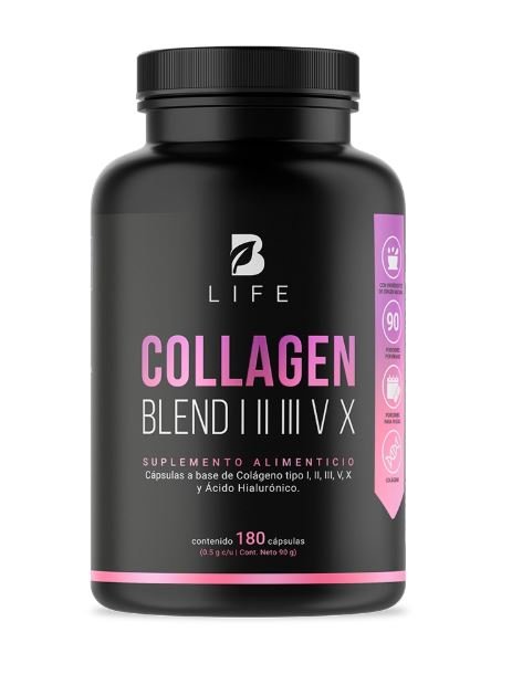 Explora la formulación de Collagen Blend B Life®, con 500 mg por cápsula que integran 5 tipos de colágeno: I, II, III, V y X.