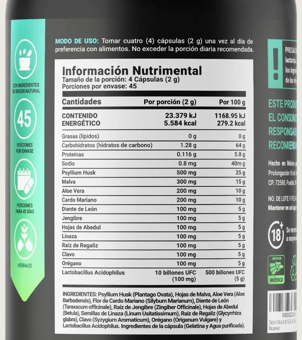Dtox Blend B Life® contiene 500 mg por cápsula en una combinación que integra psyllium husk, malva, Aloe vera, cardo mariano, diente de león, jengibre, hojas de abedul, linaza, raíz de regaliz, clavo, orégano y Lactobacillus acidophilus.