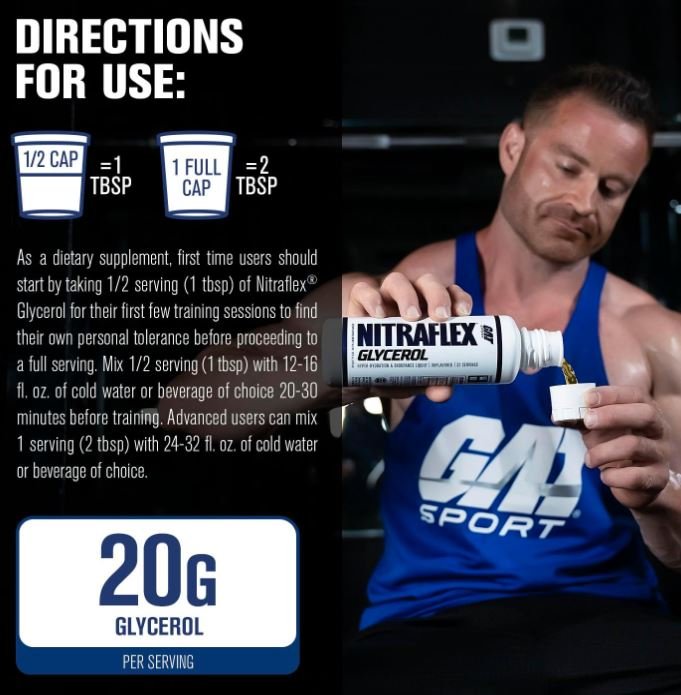 Agitar bien antes de cada uso. Como suplemento dietético, quienes lo usan por primera vez deben comenzar tomando 1/2 porción (1 cucharada) de Nitraflex Glycerol durante sus primeras sesiones de entrenamiento para encontrar su tolerancia personal antes de proceder a una porción completa. Mezcle 1/2 porción (1 cucharada) con 350-450 ml de agua fría o la bebida de su elección 20-30 minutos antes del entrenamiento. Los usuarios avanzados pueden mezclar 1 porción (2 cucharadas) con 700-900 ml de agua fría o la bebida de su elección. Refrigerar después de abrir